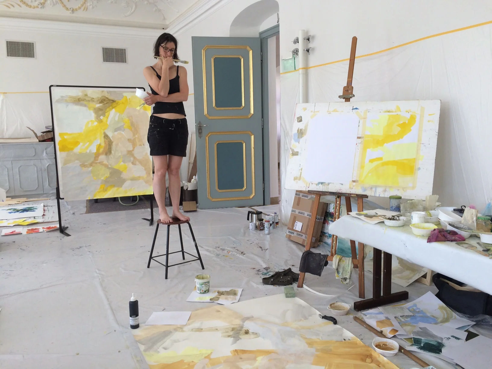 Raum erspüren - das Zusammensetzen von Bildern, aus dem Gesehenen Neues fügen, suchend, Schicht um Schicht in der Malerei, Druckstock um Druckstock beim Holzschnitt.
